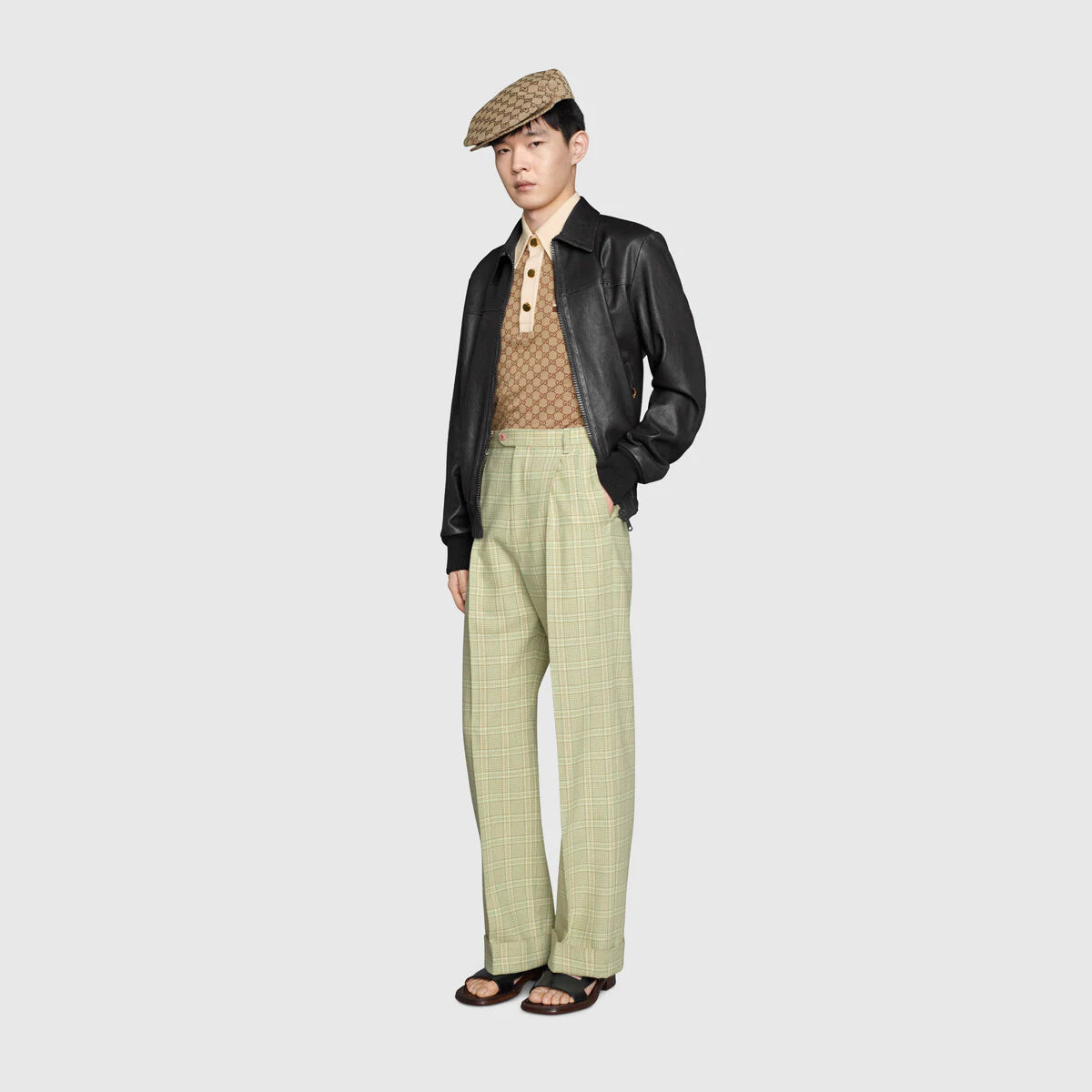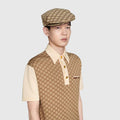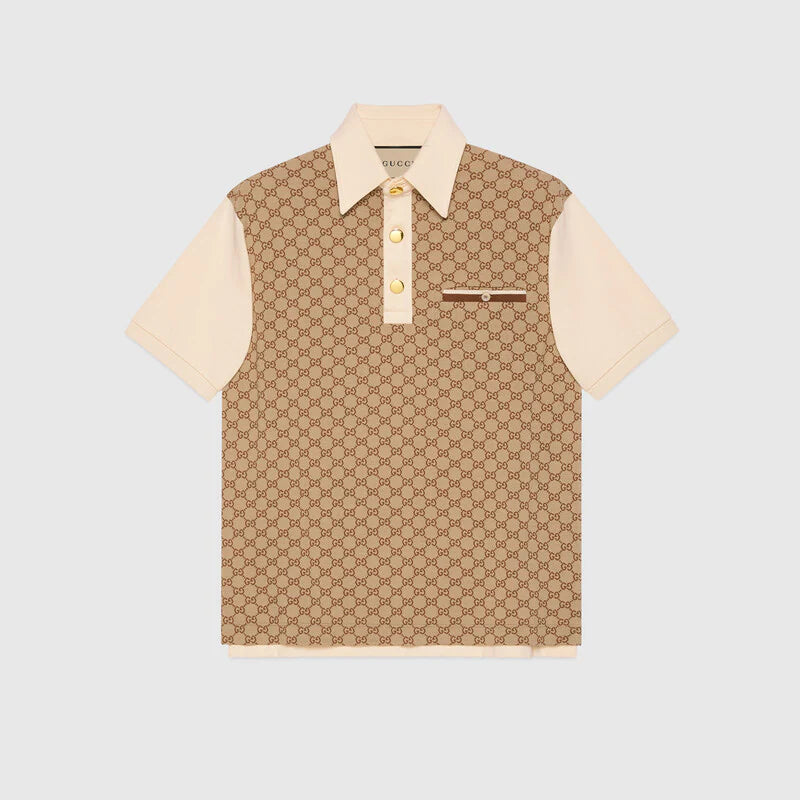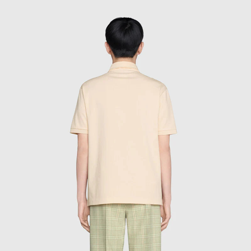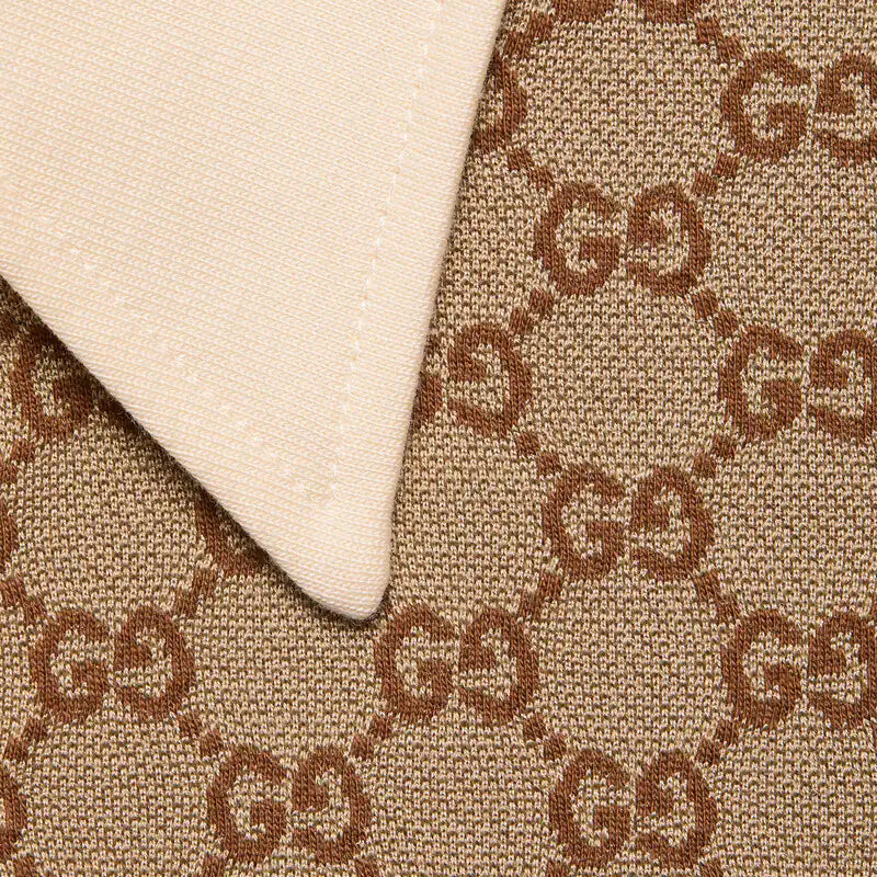 This polo with an ivory heavy cotton base is defined by its beige and ebony silk cotton jacquard front. Known for its array of patterns, materials and silhouettes, emblematic House codes like the GG motif play upon the familiar college style in creative ways.
