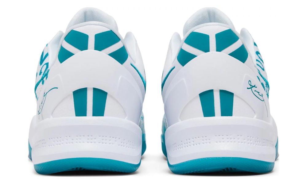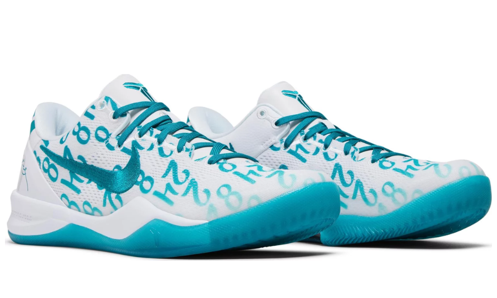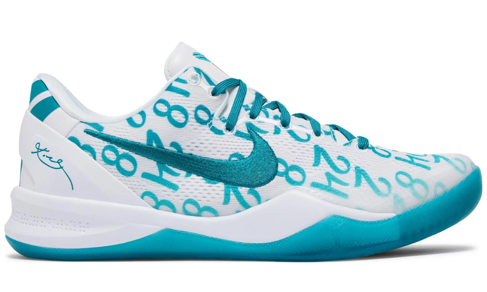 The Nike Kobe 8 Protro ‘Radiant Emerald’ features a white Engineered Mesh upper, covered in an all-over print made up of the jersey numbers that Kobe Bryant wore during his NBA career. An embroidered teal Swoosh adorns the lateral side, while the Mamba’s sheath logo adorns the tongue. The athlete’s signature appears on the lateral heel counter. Lightweight cushioning arrives via a drop-in React foam midsole. Underfoot, a herringbone-traction rubber outsole reveals an exposed carbon fiber shank plate.