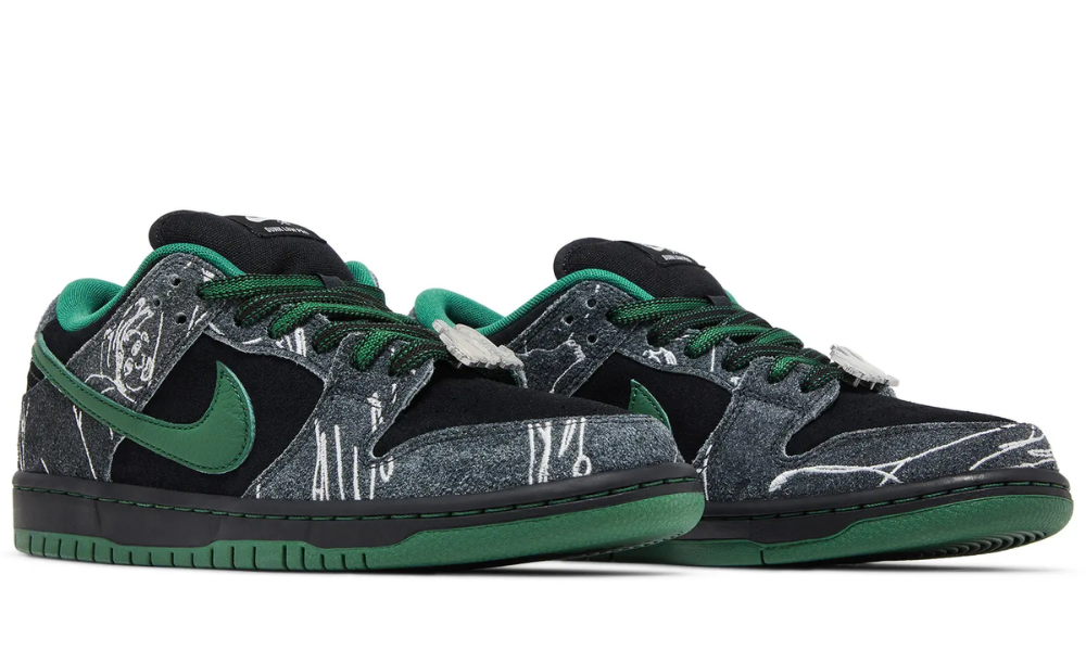 The THERE Skateboards x Nike Dunk Low SB 'Ultra Humanized' merges unique details with custom artwork. Secured with split-colored laces, the upper features a black suede base with grey hairy suede overlays covered in embroidered graphics. The leather Swoosh is rendered in Gorge Green, matching the textile collar lining. Co-branding appears on the tongue, back tab and sockliner. This pair comes in a special box that showcases original artwork from Jeff Cheung, the co-founder of THERE Skateboards.